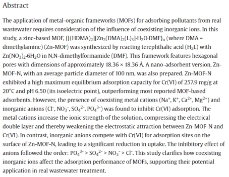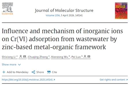 近日,我院资源循环科学与工程专业教研室李石雄博士团队研究论文“Influence and mechanism of inorganic ions on Cr(VI) adsorption from wastewater by zinc-based metal-organic framework”在《Journal of Molecular Structure》(2025年,中科院:2区,影响因子:4.7)期刊上发表。我校为第一单位,李石雄博士为第一作者。