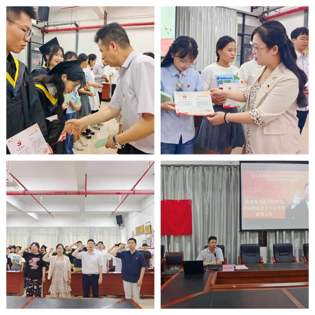 座谈会在与会人员庄严的国歌声中拉开序幕。张立杰老师和许玉婷老师一起向毕业生党员代表赠送政治生日贺卡和纪念品并向全体毕业生党员致以诚挚的祝福。随后全体师生党员佩戴党员徽章、面向党旗,举起右拳,再次重温铿锵有力的宣誓。在毕业生党员进行亲切交流后,张立杰书记给大家上了最后一堂党课并合影留恋。