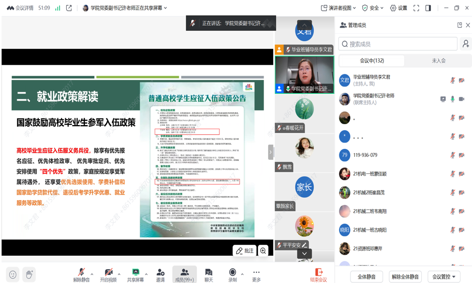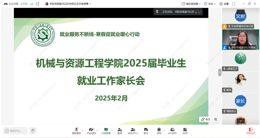 2月19日晚,机械与资源工程学院通过腾讯会议平台召开2025届毕业生就业工作家长会。学院党委副书记许玉婷、毕业班辅导员及全体2025届毕业生家长参会。