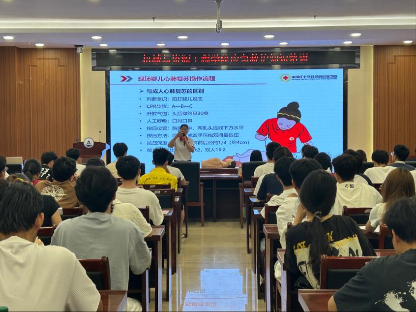 培训现场,梧州市红十字会的专家及医生结合近年来校园突发疾病案例,以通俗易懂的语言讲解心肺复苏的操作流程和黄金救援时间,配合视频演示和现场实操介绍,重点强调自动体外除颤器(AED)作为“救命神器”在心脏骤停急救中的关键作用以及“尽早除颤”对挽救生命的重要意义。