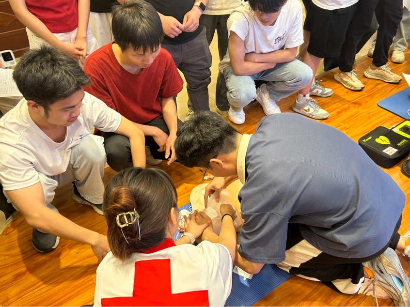 实操环节,专家团队一对一指导,师生分组开展心肺复苏与AED配合使用的模拟演练,针对胸外按压深度、频率,AED操作时机等细节进行纠正,确保每位参与者掌握规范动作。现场学习氛围浓厚,师生们积极提问、反复练习,力求将理论知识转化为实际操作能力。