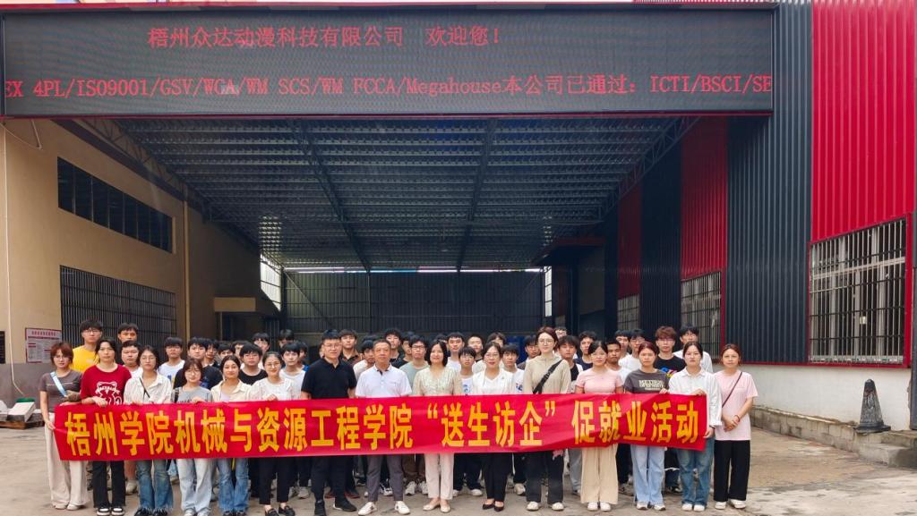 为促进毕业生高质量就业,提高就业匹配度,推进政校企合作产教融合,5月21日上午,机械与资源工程学院携手梧州市藤县人力资源和社会保障局,组织毕业班辅导员、毕业生代表一行49人,先后来到广西宏胜陶瓷有限公司、梧州众达动漫科技有限公司以及藤县飞乐电子科技有限公司进行实地参观考察。